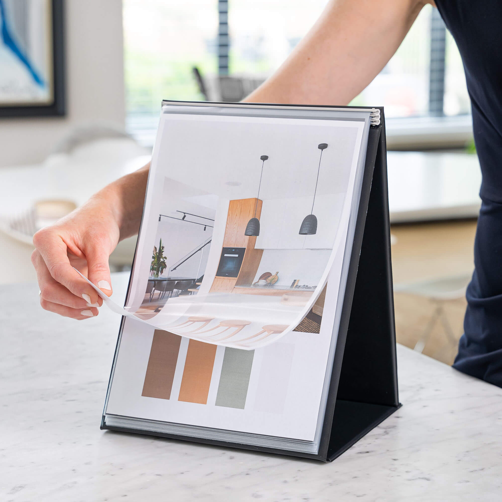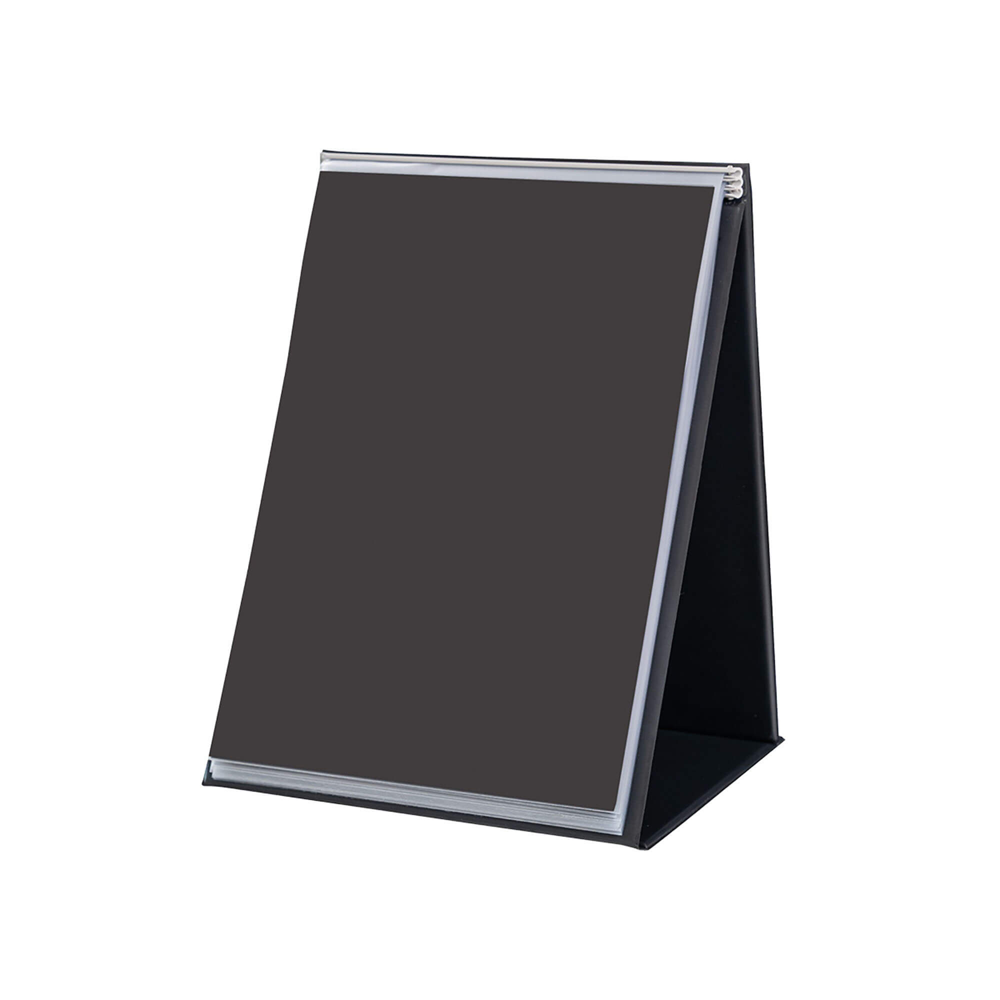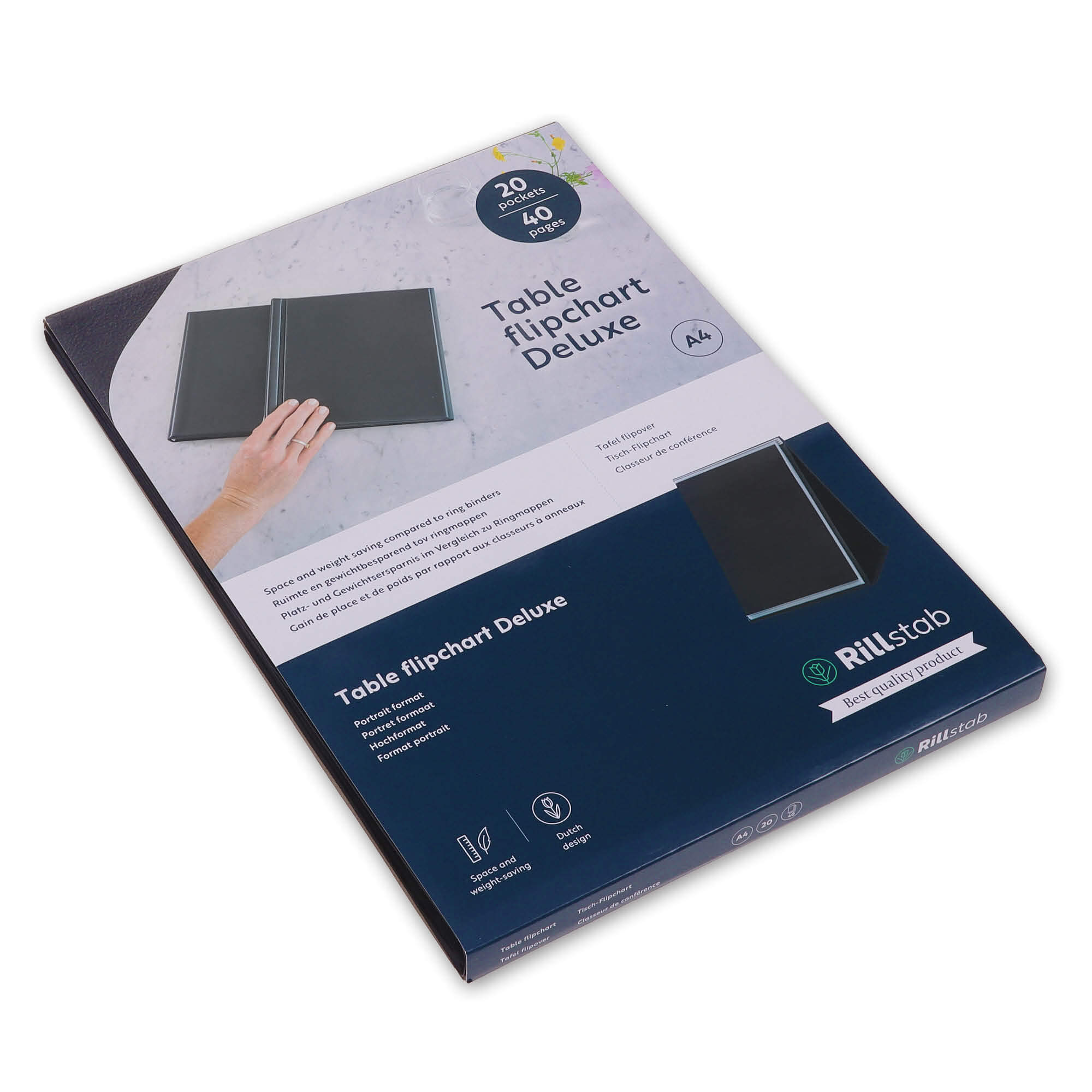 Rillstab table flipchart A4 portrait format, made of plastic material. Provided in the back with the Rillstab mechanism filled with 20 environmentally friendly anti-reflex pockets made from acid-free polypropylene, to insert documents on the right side. Turning the pockets is very easy and the pockets do not fall back. The table flip chart is easy to set up in a triangular shape, can be folded quickly and takes up little space. Ideally suited for presentations to small groups.