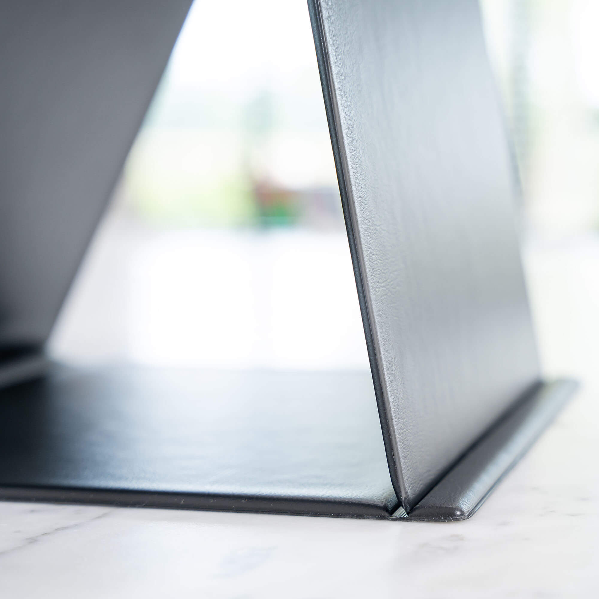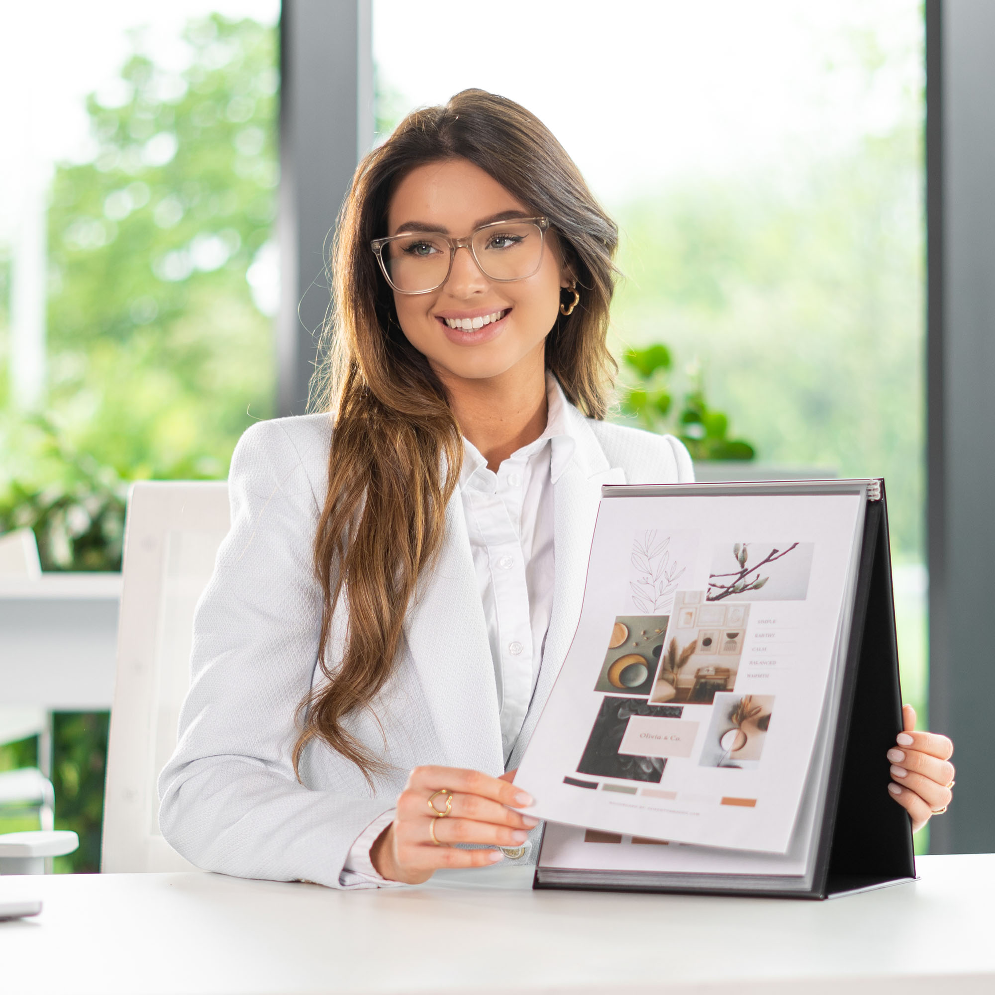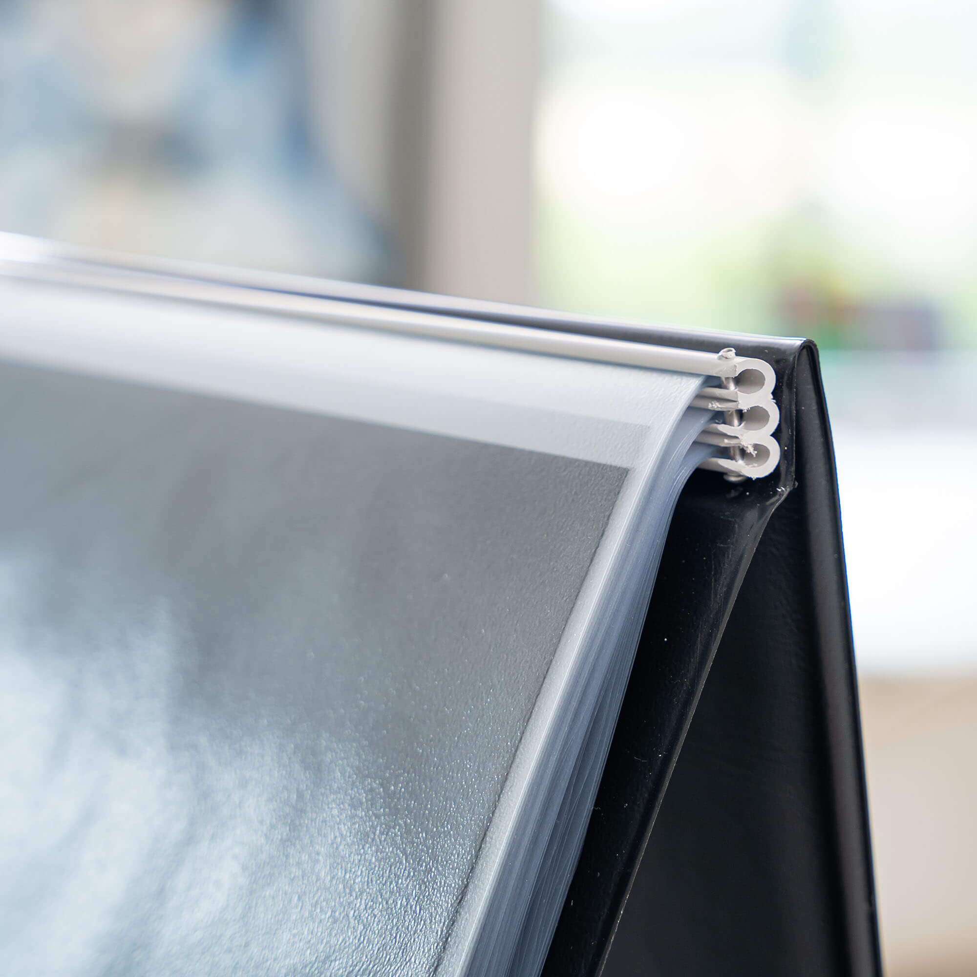 Rillstab table flipchart A4 portrait format, made of plastic material. Provided in the back with the Rillstab mechanism filled with 20 environmentally friendly anti-reflex pockets made from acid-free polypropylene, to insert documents on the right side. Turning the pockets is very easy and the pockets do not fall back. The table flip chart is easy to set up in a triangular shape, can be folded quickly and takes up little space. Ideally suited for presentations to small groups.