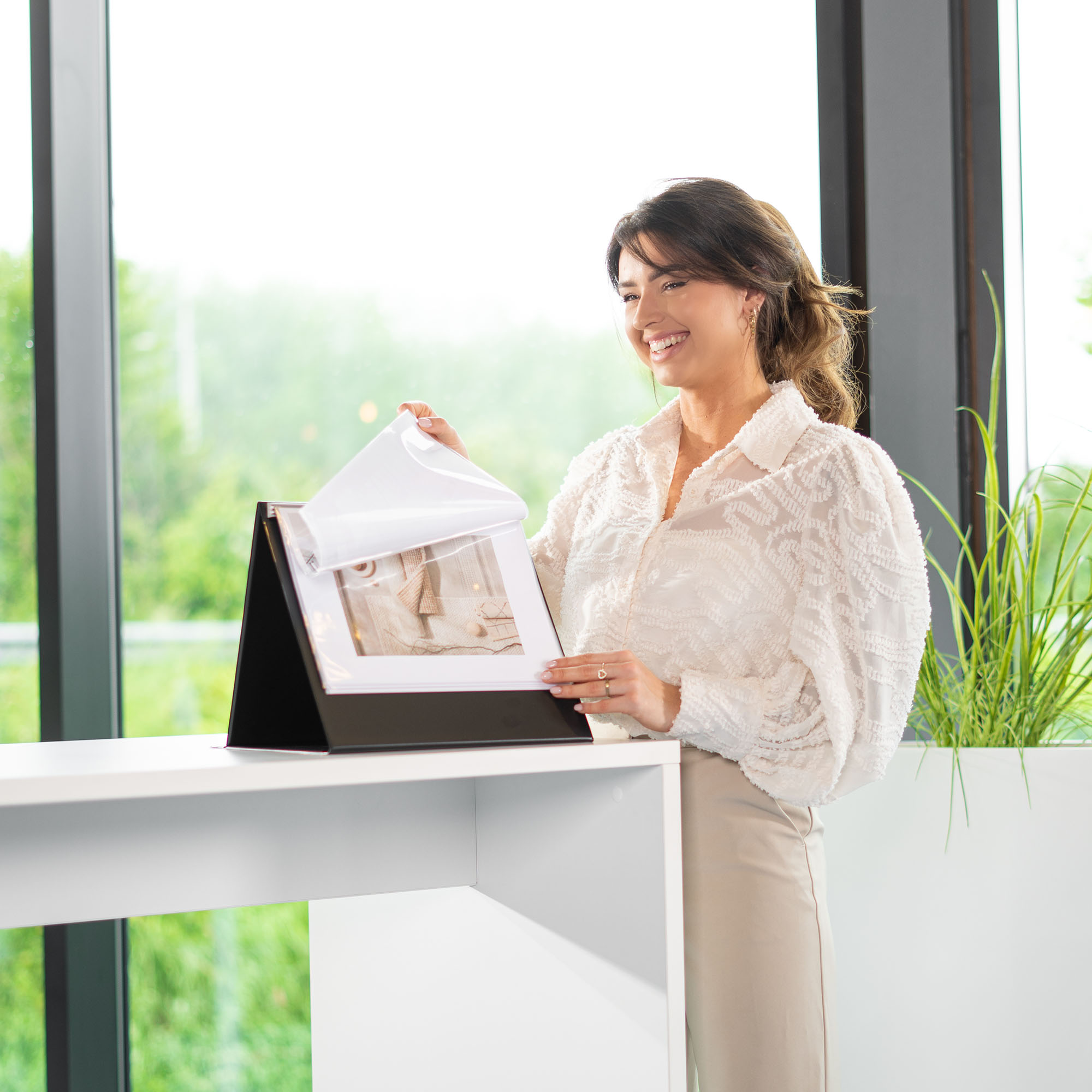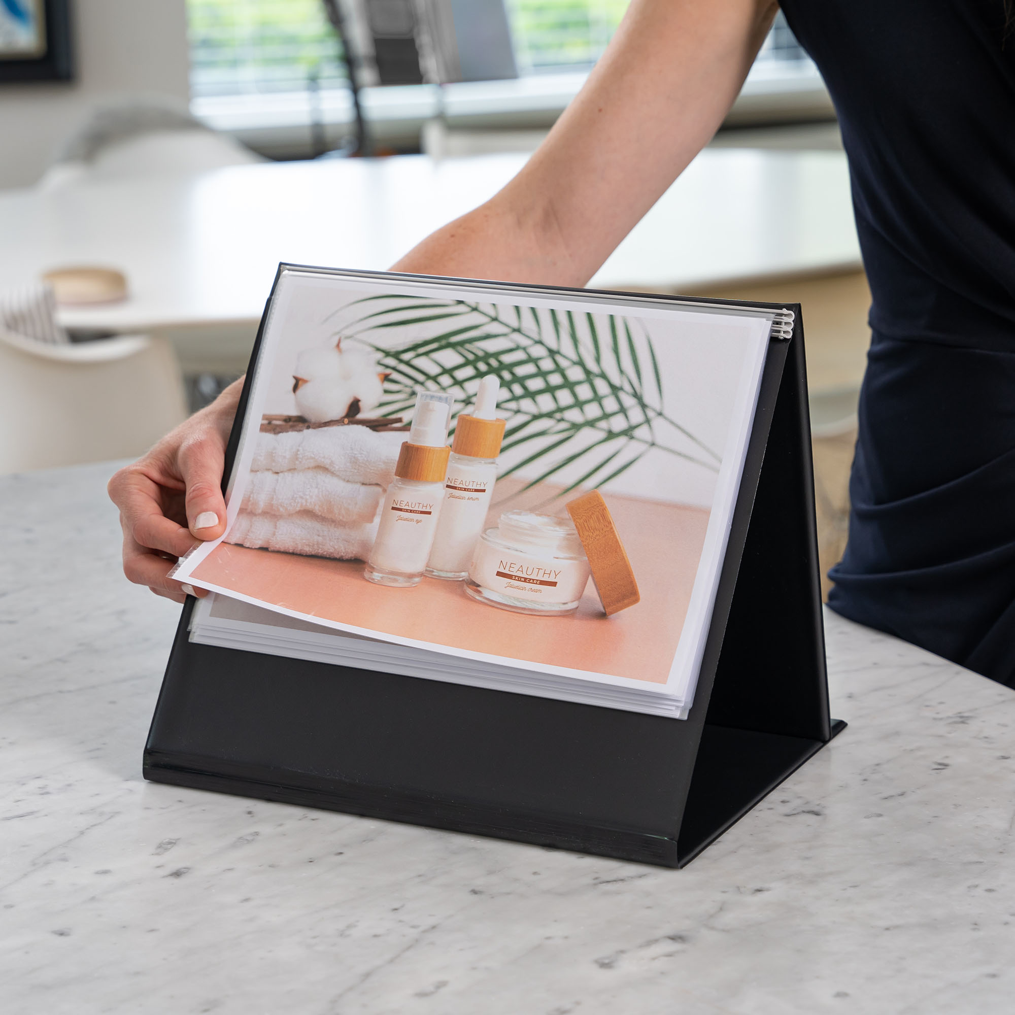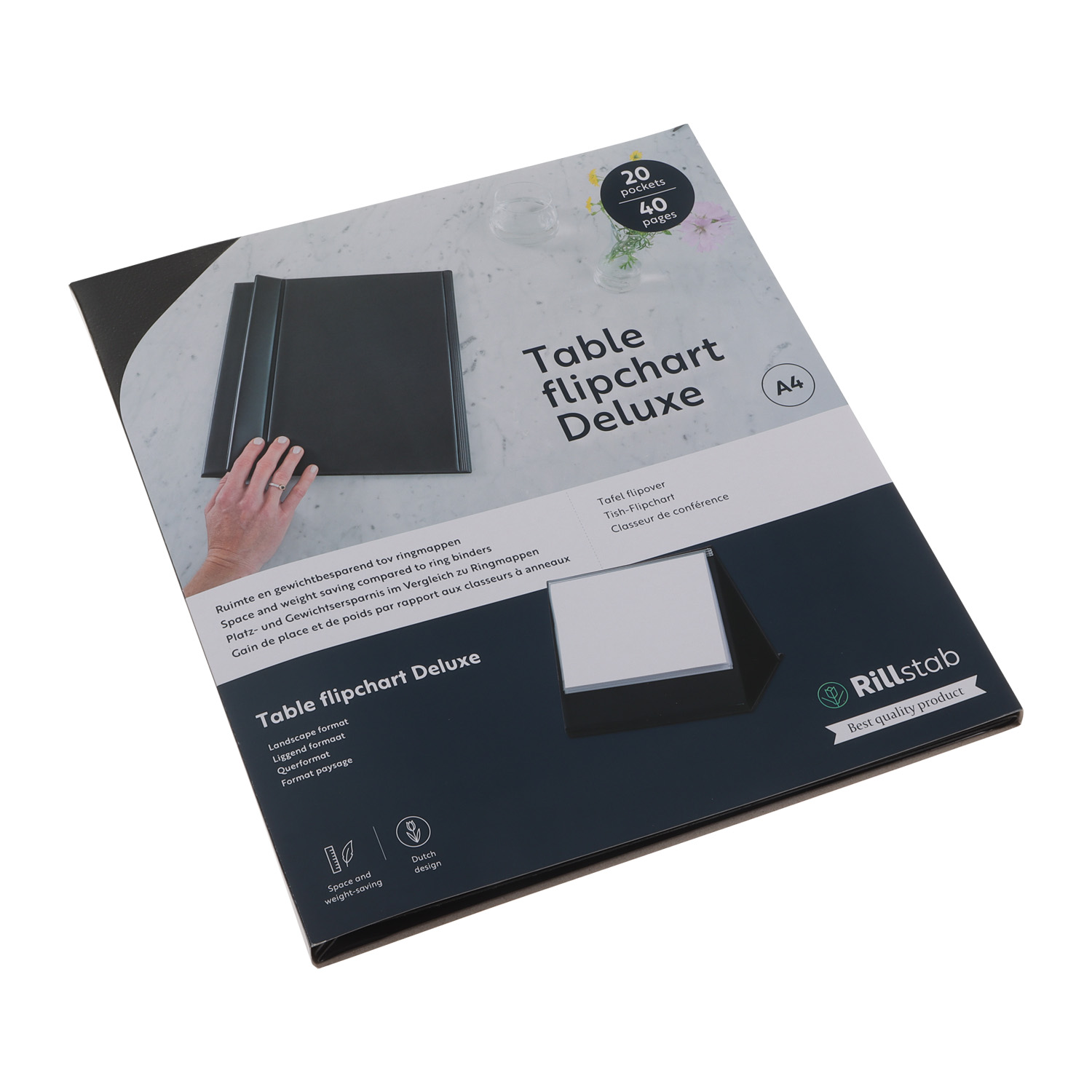 Rillstab table flipchart A4 landscape format, made of plastic material. Provided in the back with the Rillstab mechanism filled with 20 environmentally friendly anti-reflex pockets made from acid-free polypropylene, to insert documents on the right side. Turning the pockets is very easy and the pockets do not fall back. The table flip chart is easy to set up in a triangular shape, can be folded quickly and takes up little space. Ideally suited for presentations to small groups.