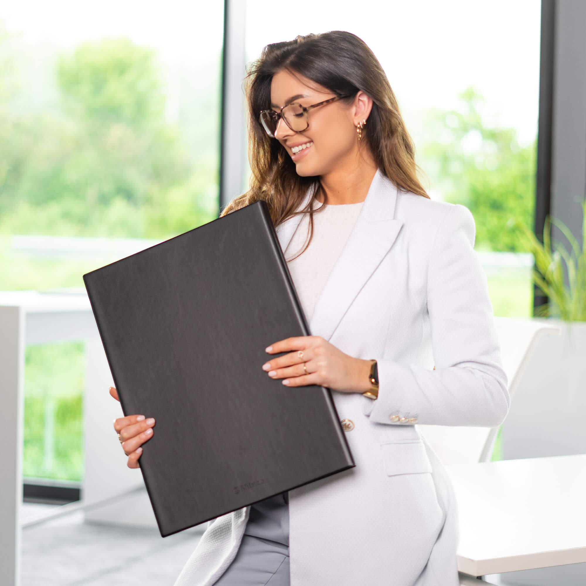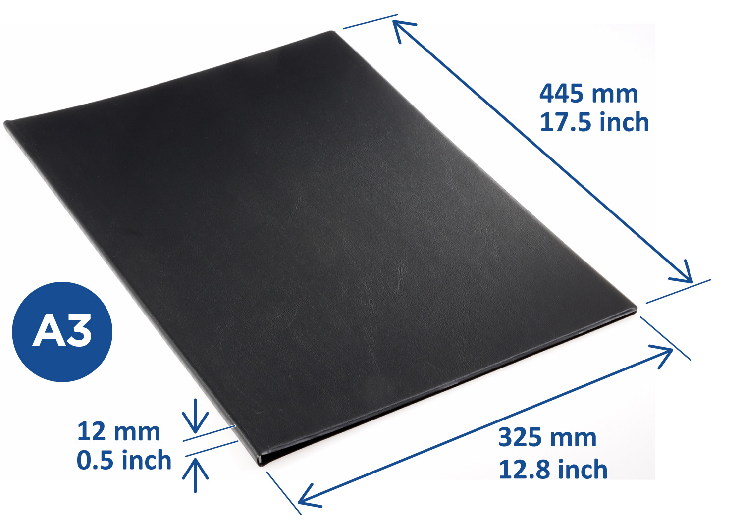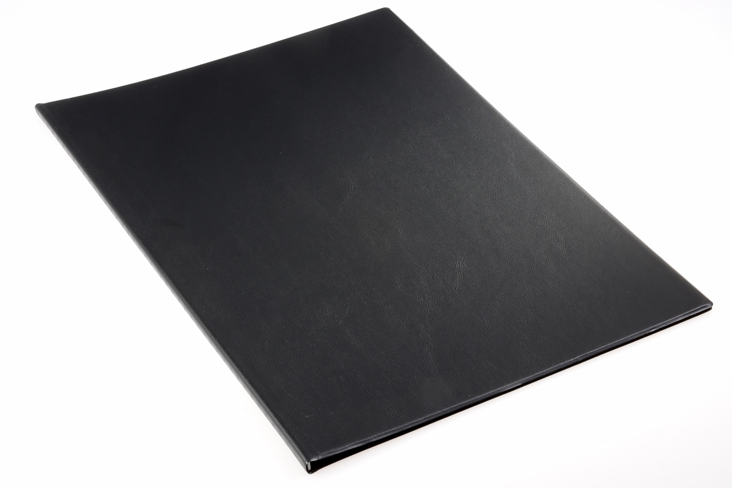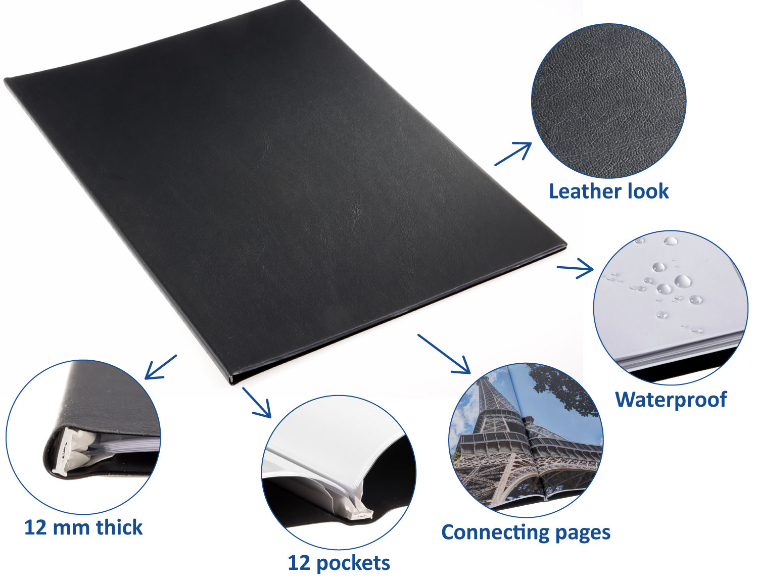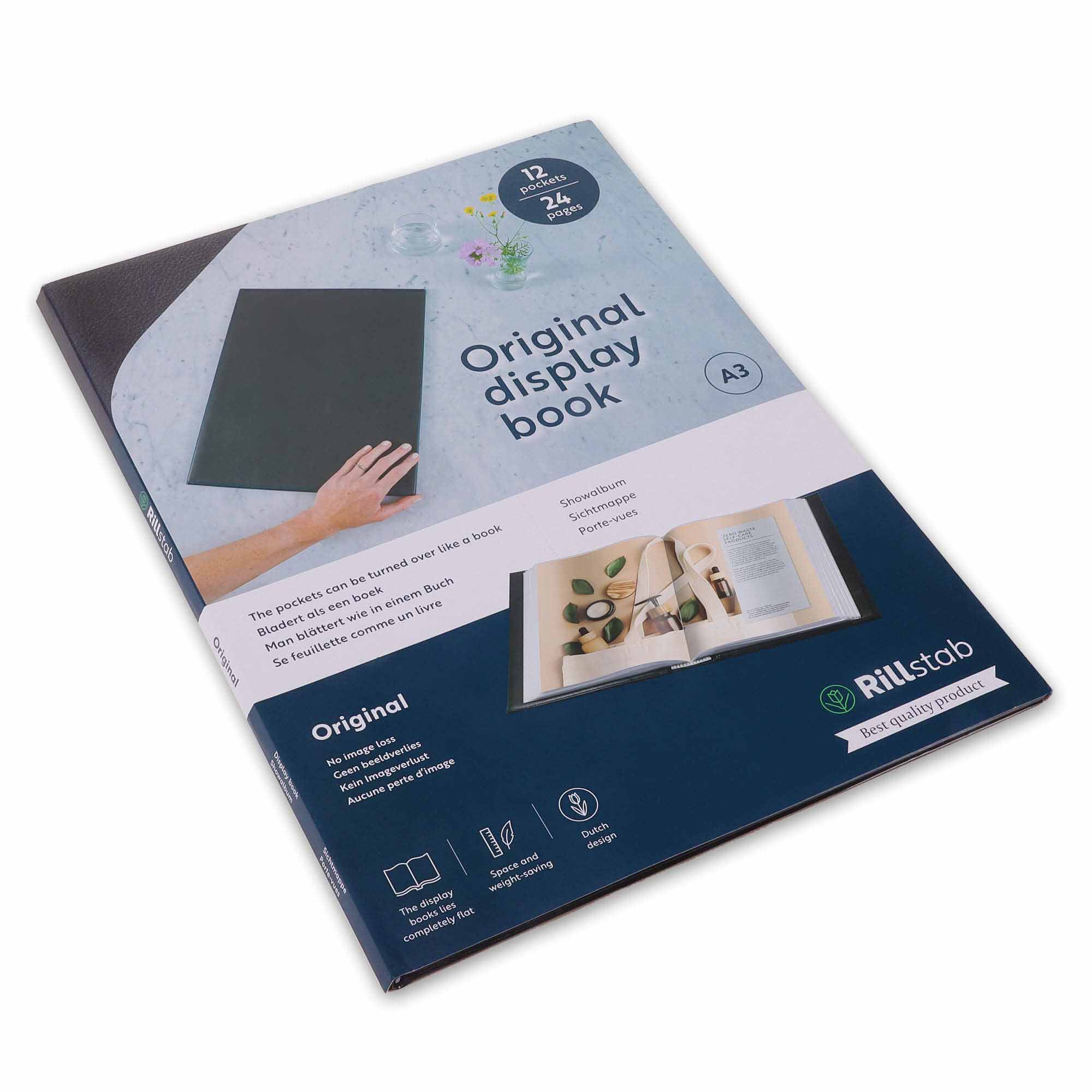 Rillstab display book A3 original made of grained plastic material. Inside, is the Rillstab mechanism, with 12 internal pockets = 24 x A3 size made from acid-free polypropylene. The internal pockets are made of polypropylene material, glass clear, non-reflecting, thickness 50 mu. On the right inside vertical insert on full height. Colour black. Space and weight-saving compared to other presentation maps and ring binders. Turn over the pages like a book.