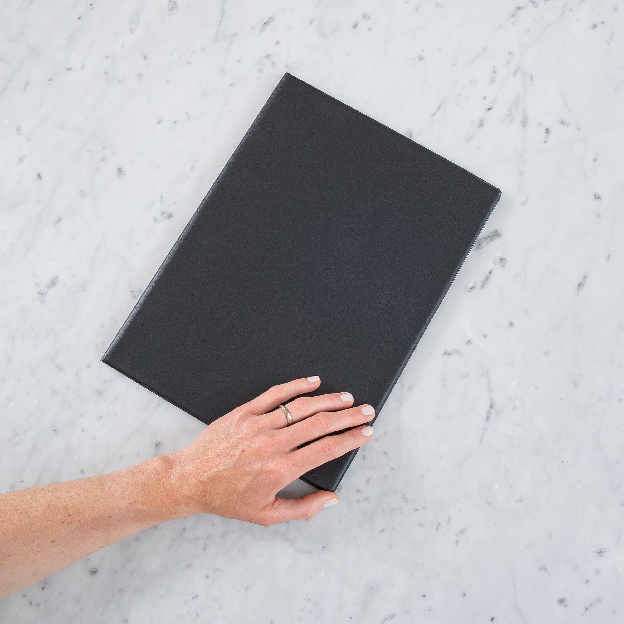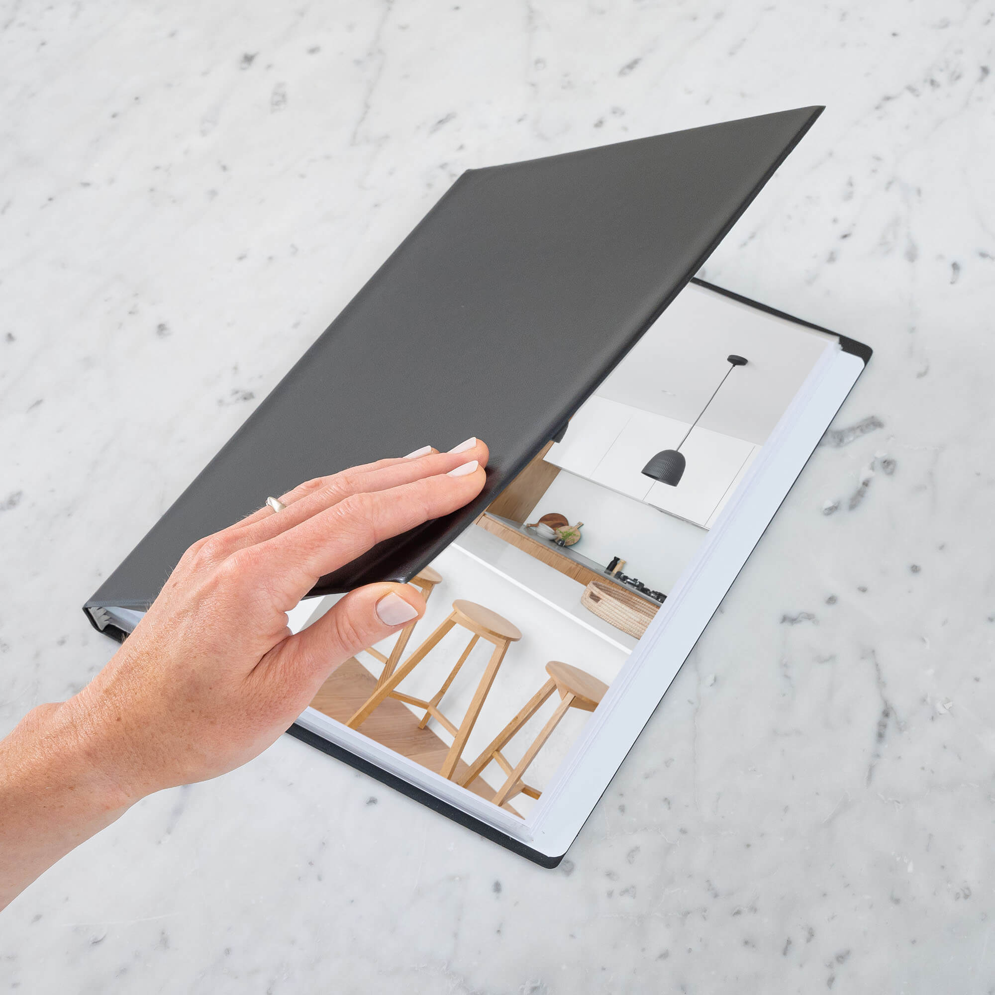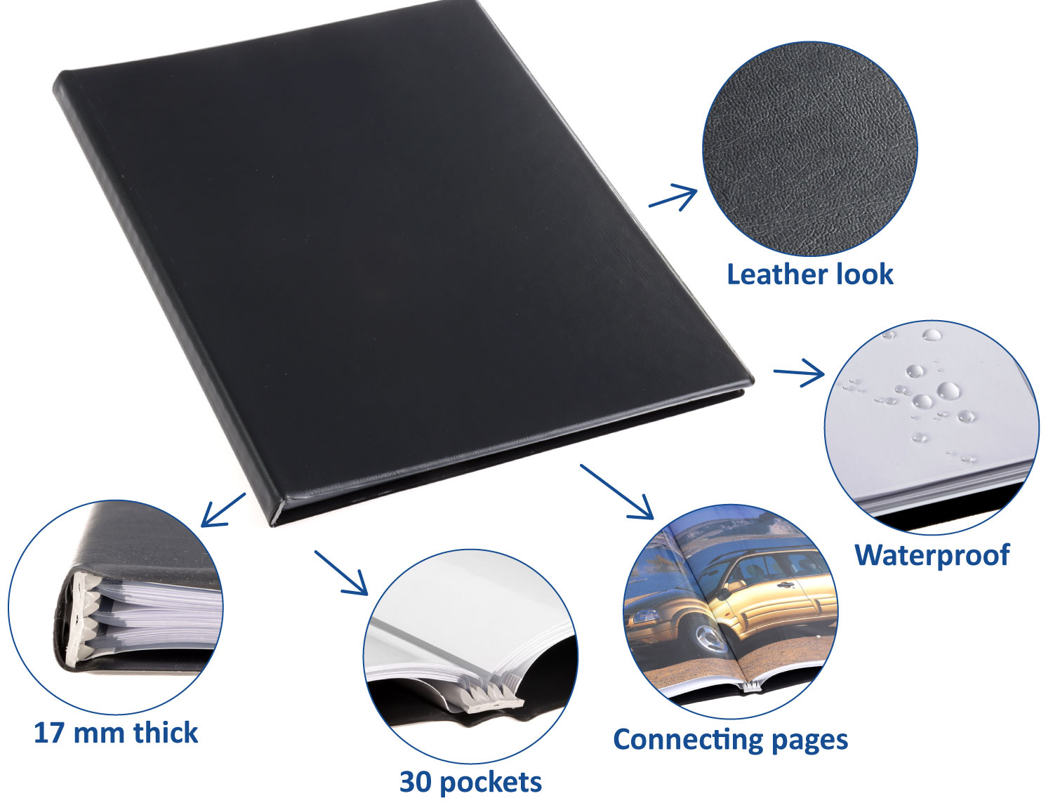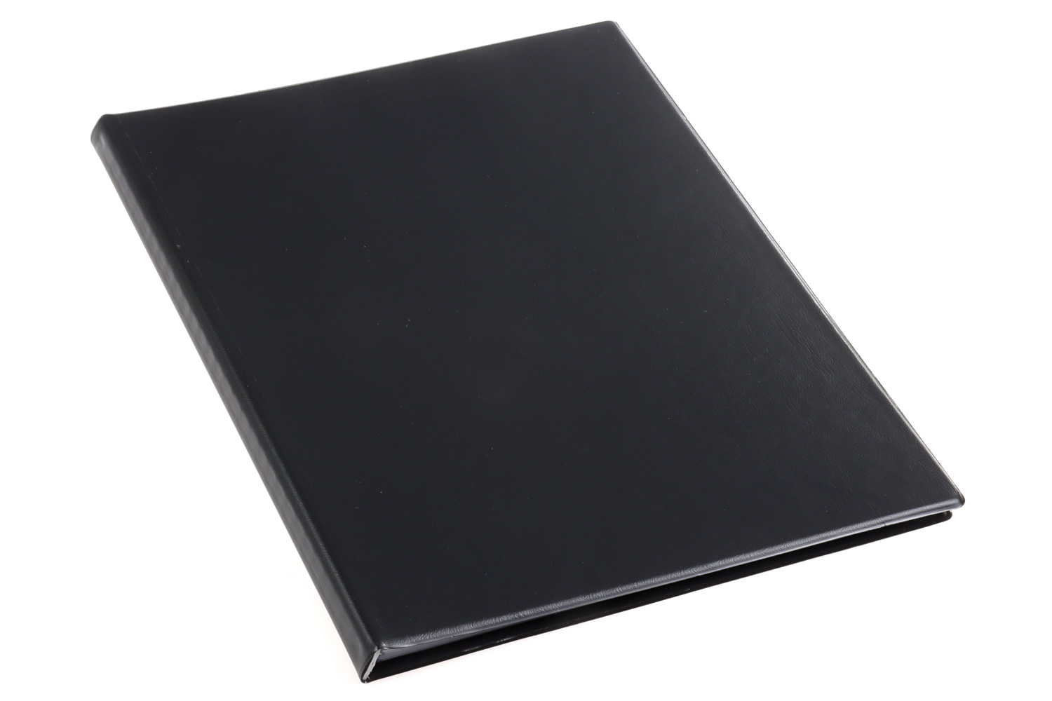 Rillstab display book A4 original made of grained plastic material. Inside, is the Rillstab mechanism, with 30 internal pockets = 60 x A4 size made from acid-free polypropylene. The internal pockets are made of polypropylene material, glass clear, non-reflecting, thickness 50 mu. On the right inside vertical insert on full height. Colour black. Space and weight-saving compared to other presentation maps and ring binders. Turn over the pages like a book.
