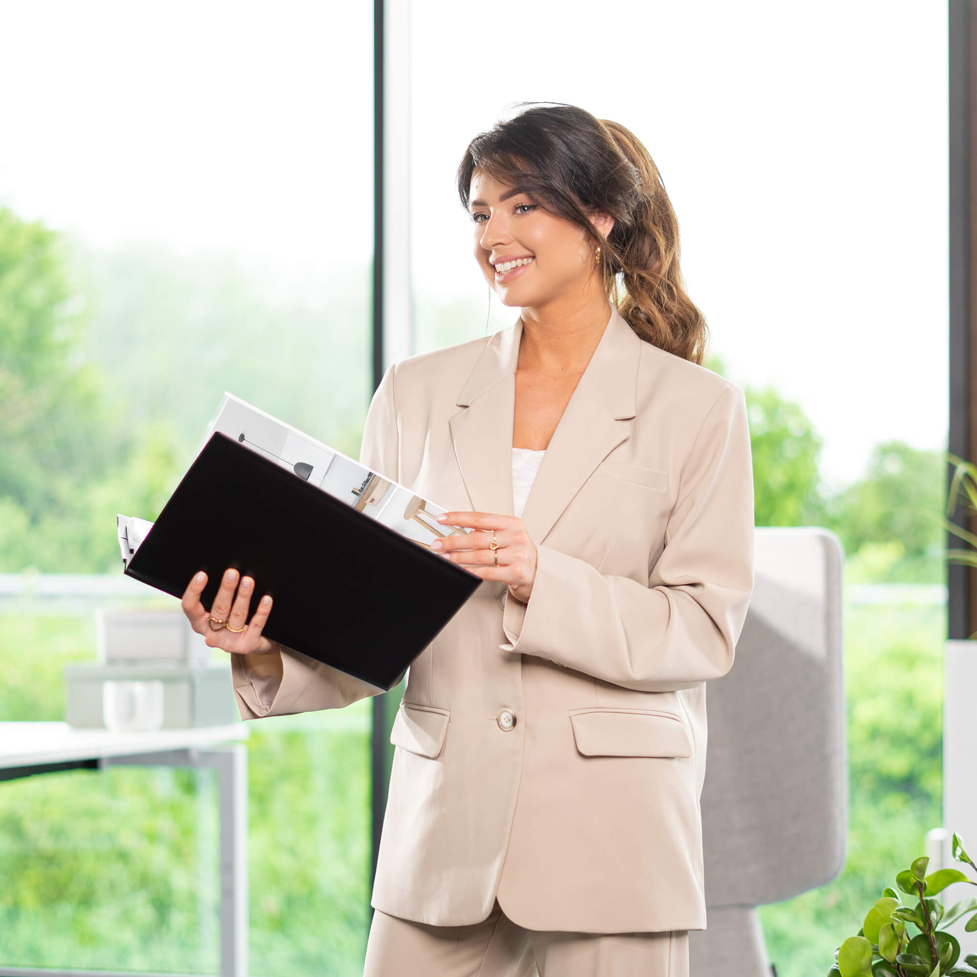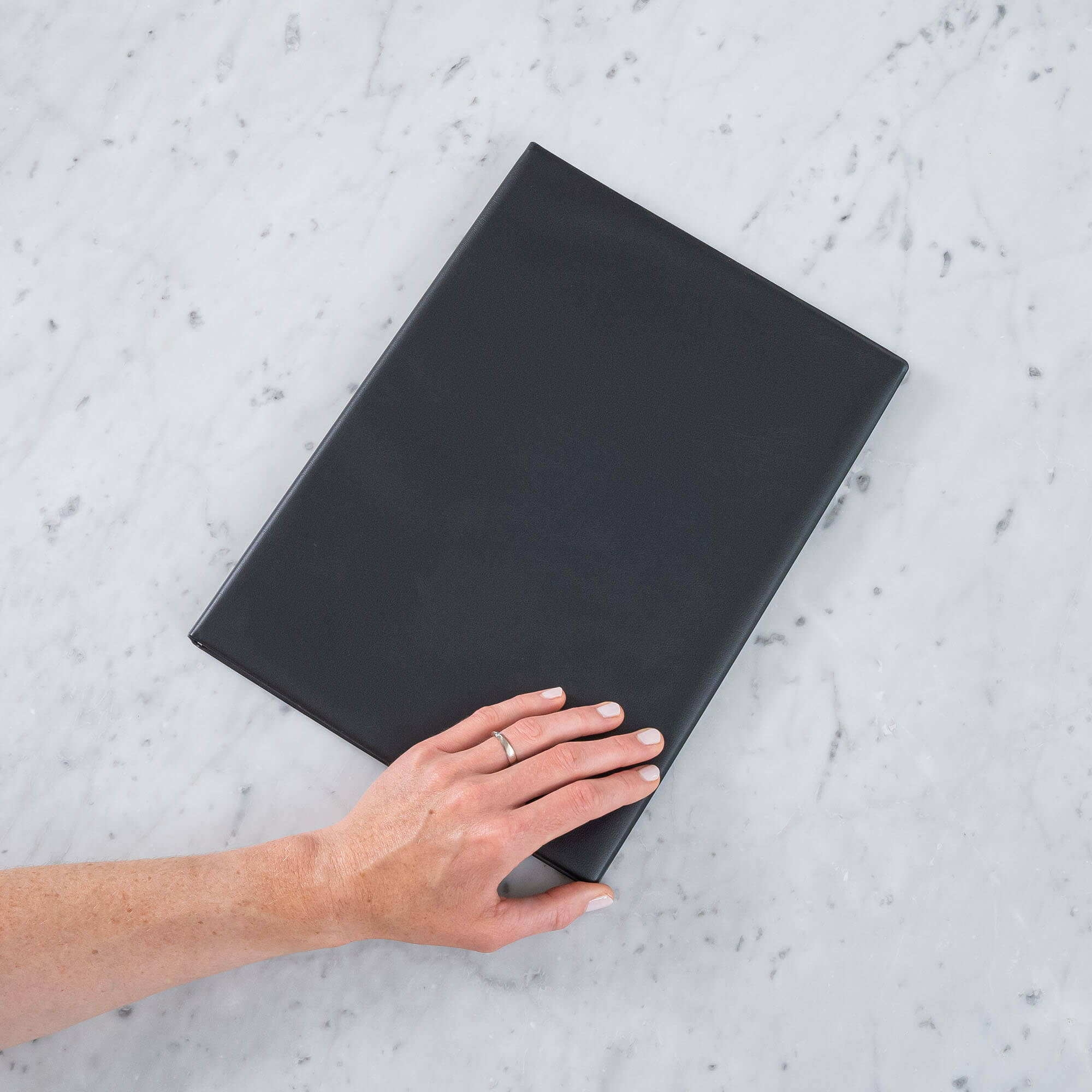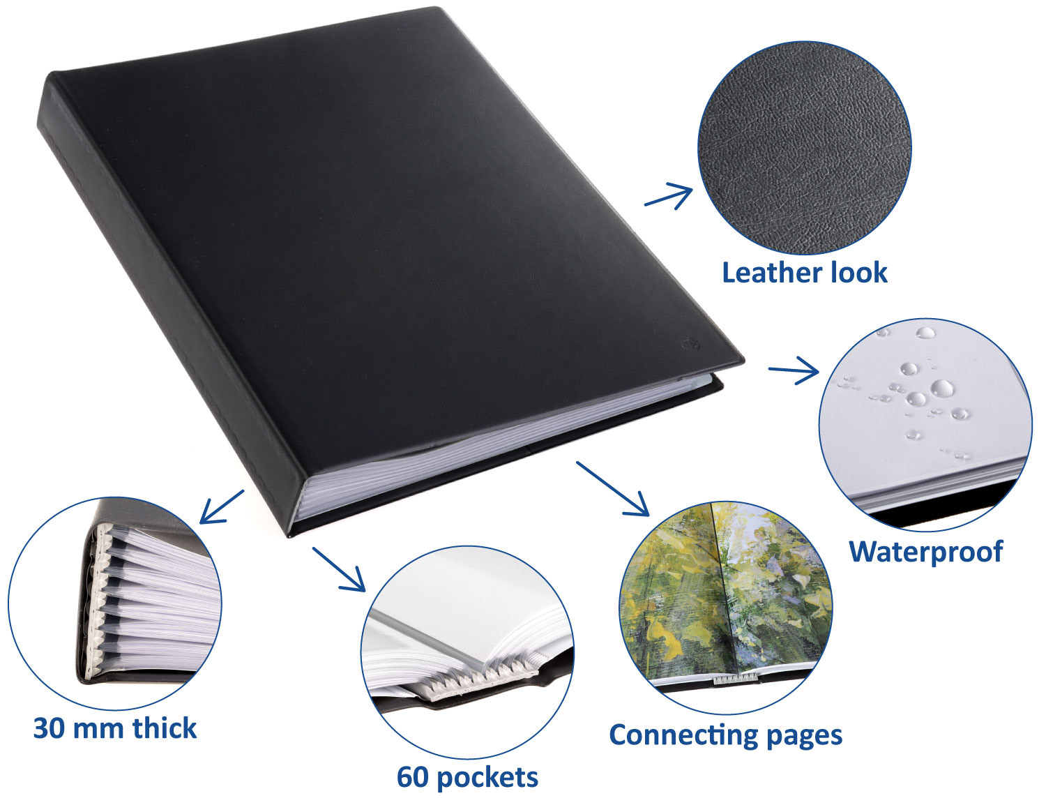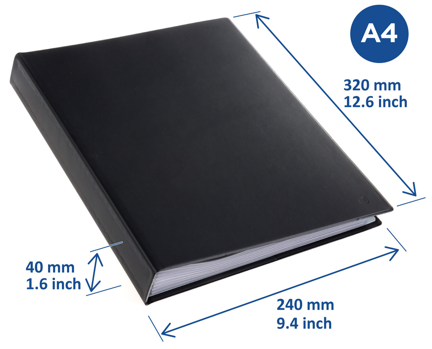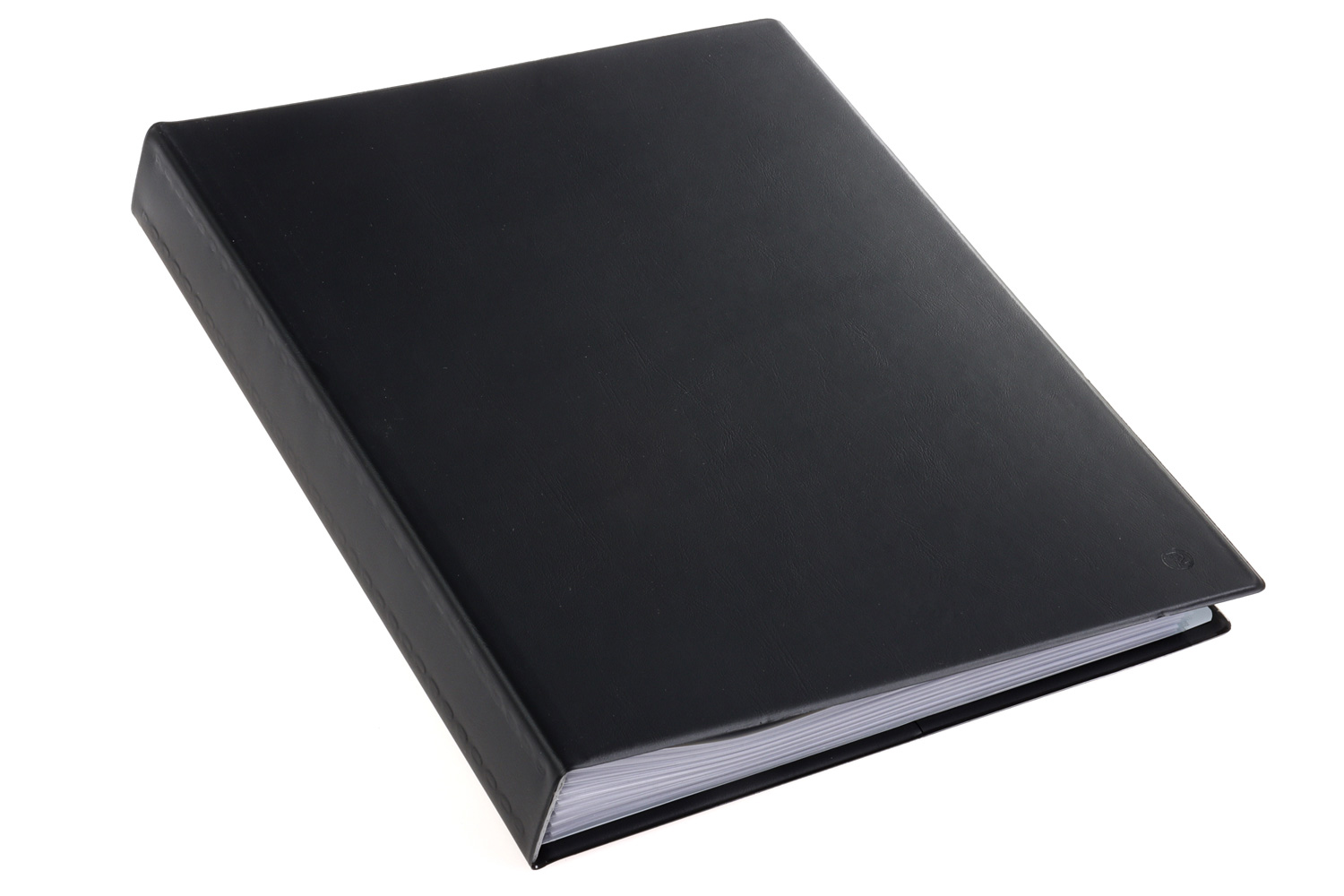 Rillstab display book A4 original made of grained plastic material. Inside, is the Rillstab mechanism, with 80 internal pockets = 160 x A4 size made from acid-free polypropylene. The internal pockets are made of polypropylene material, glass clear, non-reflecting, thickness 50 mu. On the right inside vertical insert on full height. Colour black. Space and weight-saving compared to other presentation maps and ring binders. Turn over the pages like a book.