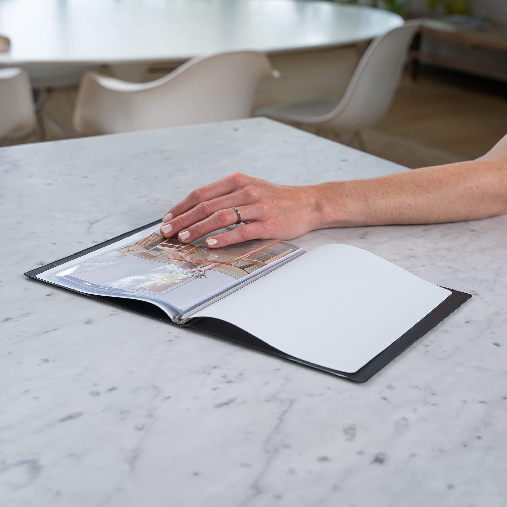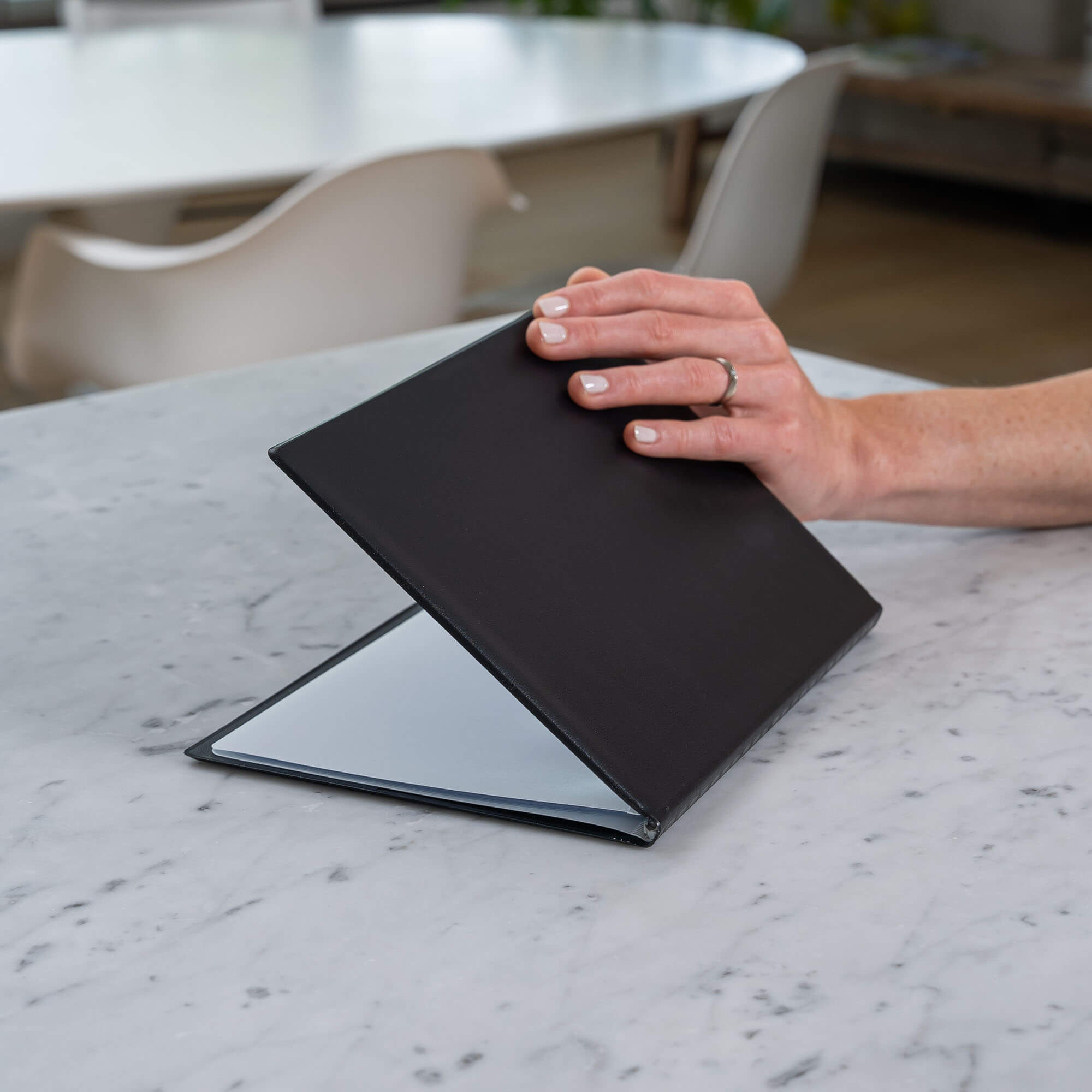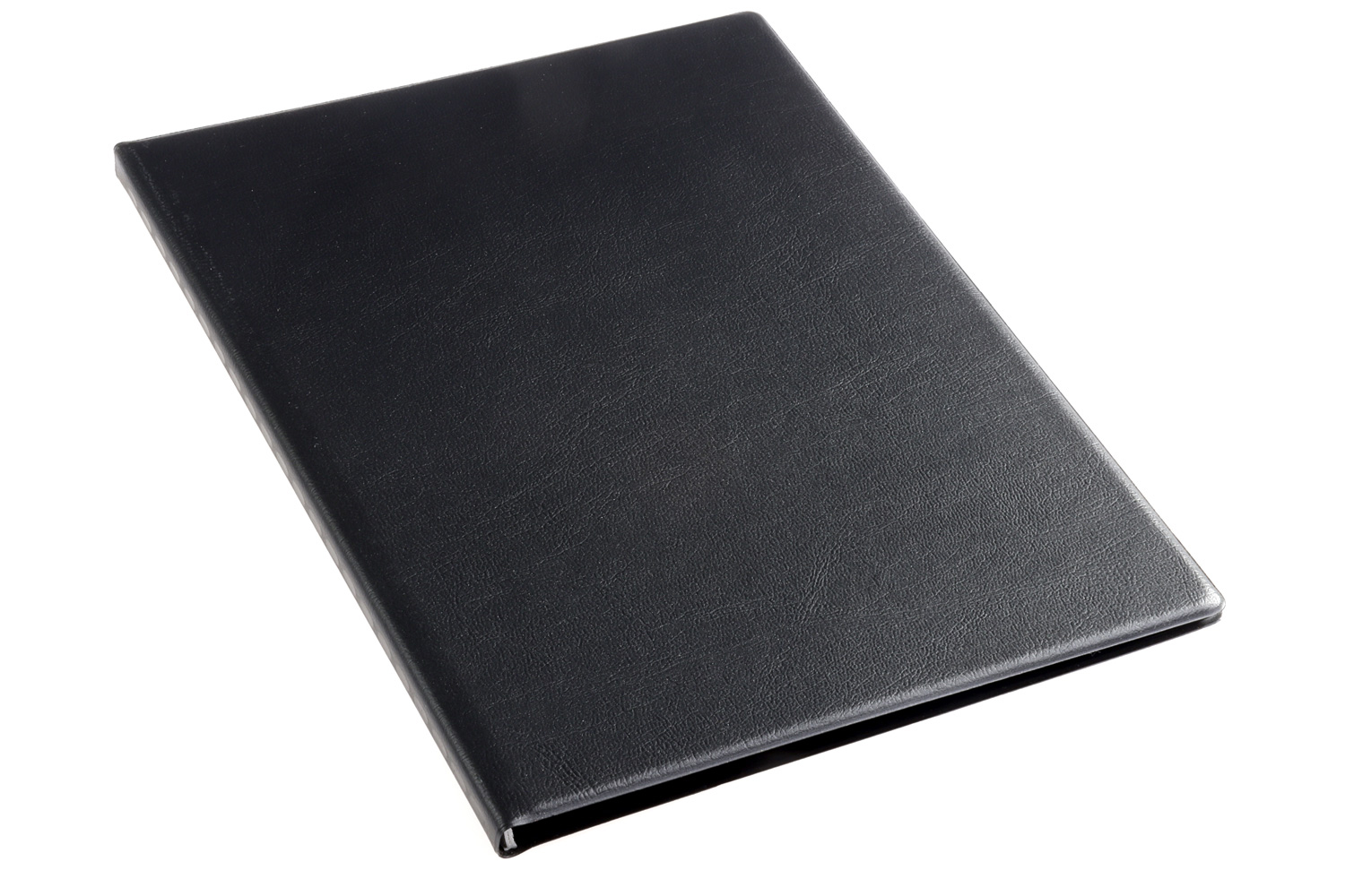 Rillstab display book A5 original made of grained plastic material. Inside, is the Rillstab mechanism, with 20 internal pockets = 40 x A5 size made from acid-free polypropylene. The internal pockets are made of polypropylene material, glass clear, non-reflecting, thickness 50 mu. On the right inside vertical insert on full height. Colour black. Space and weight-saving compared to other presentation maps and ring binders. Turn over the pages like a book.