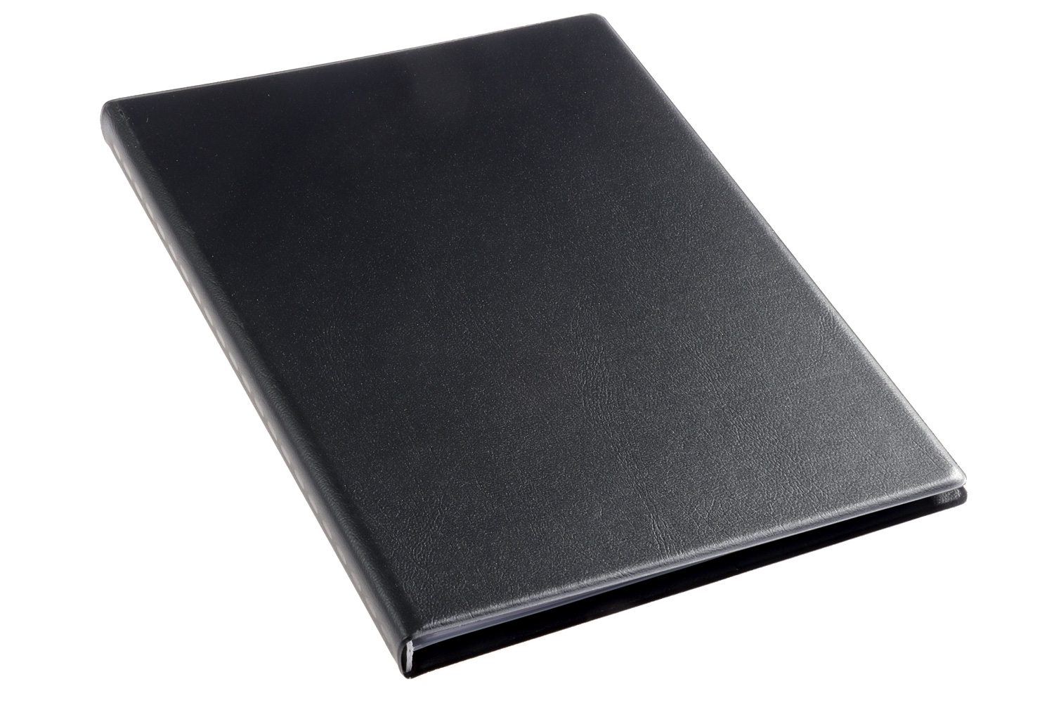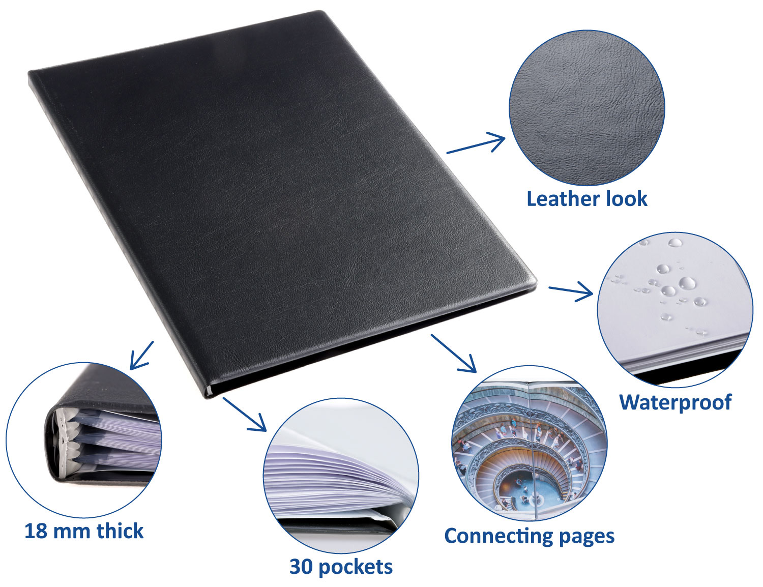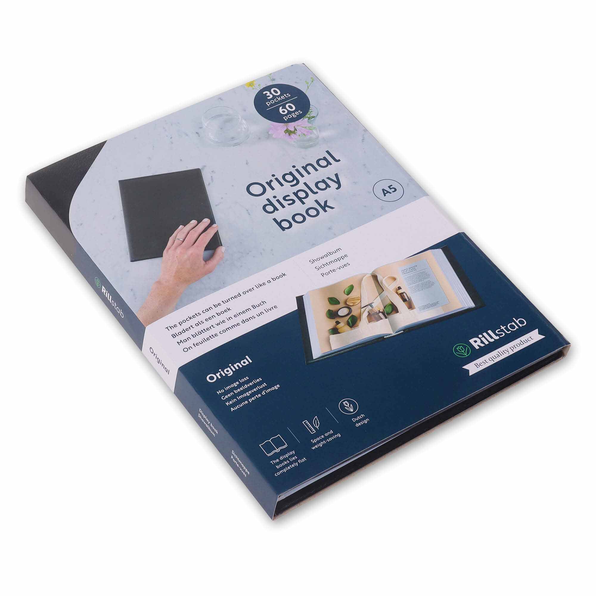 Rillstab display book A5 original made of grained plastic material. Inside, is the Rillstab mechanism, with 30 internal pockets = 60 x A5 size made from acid-free polypropylene. The internal pockets are made of polypropylene material, glass clear, non-reflecting, thickness 50 mu. On the right inside vertical insert on full height. Colour black. Space and weight-saving compared to other presentation maps and ring binders. Turn over the pages like a book.