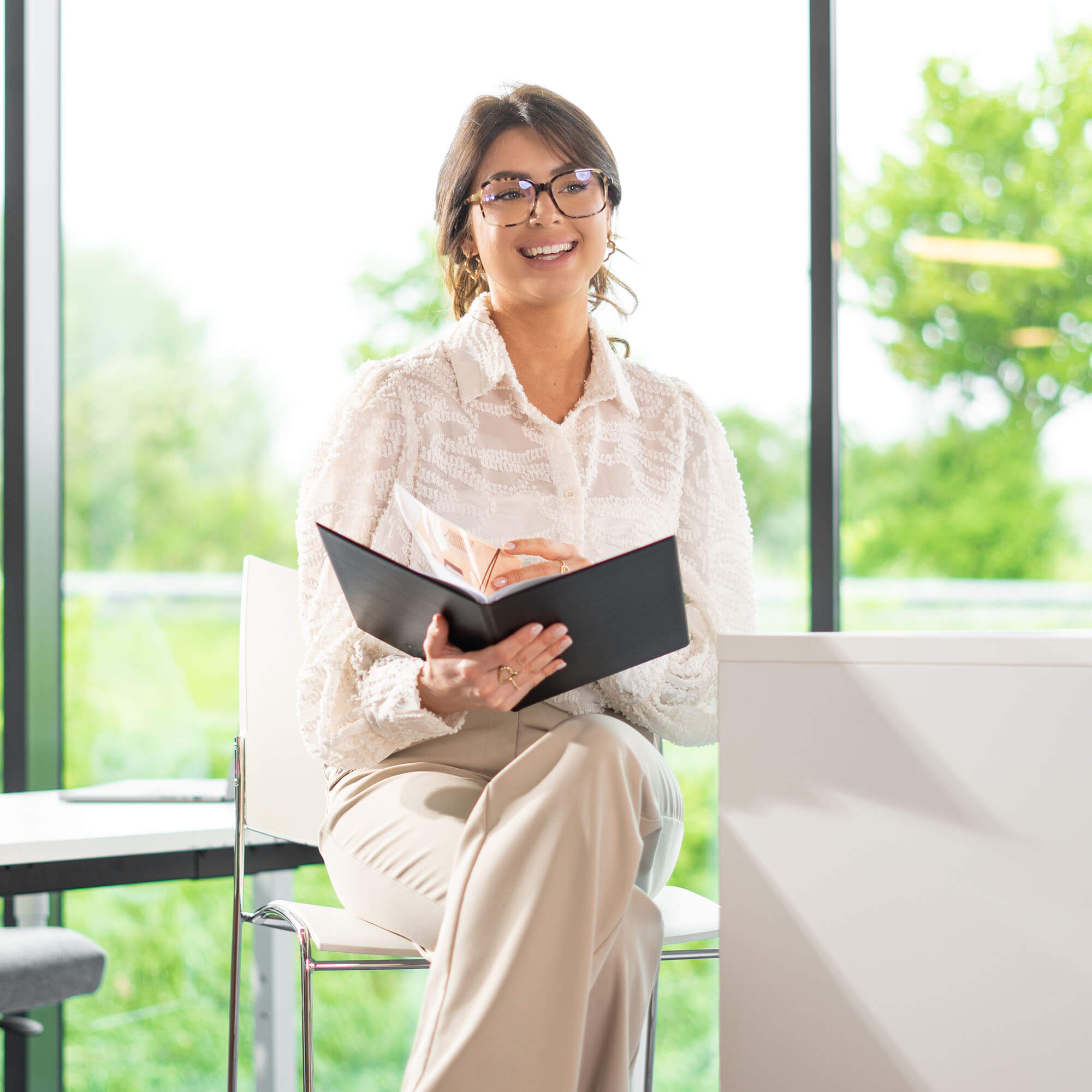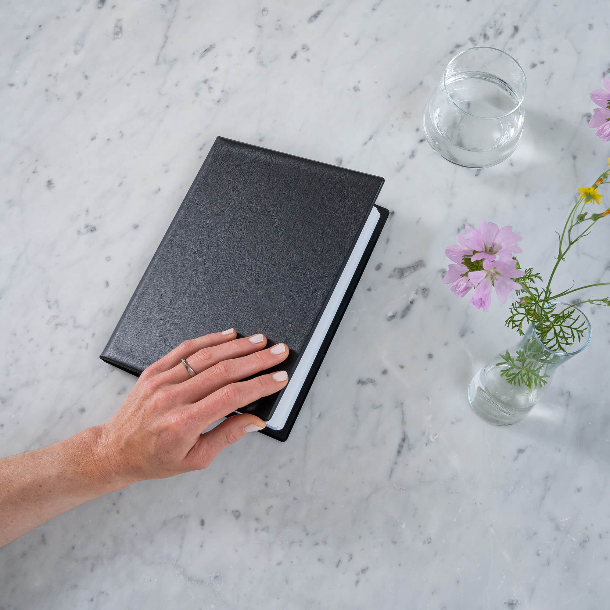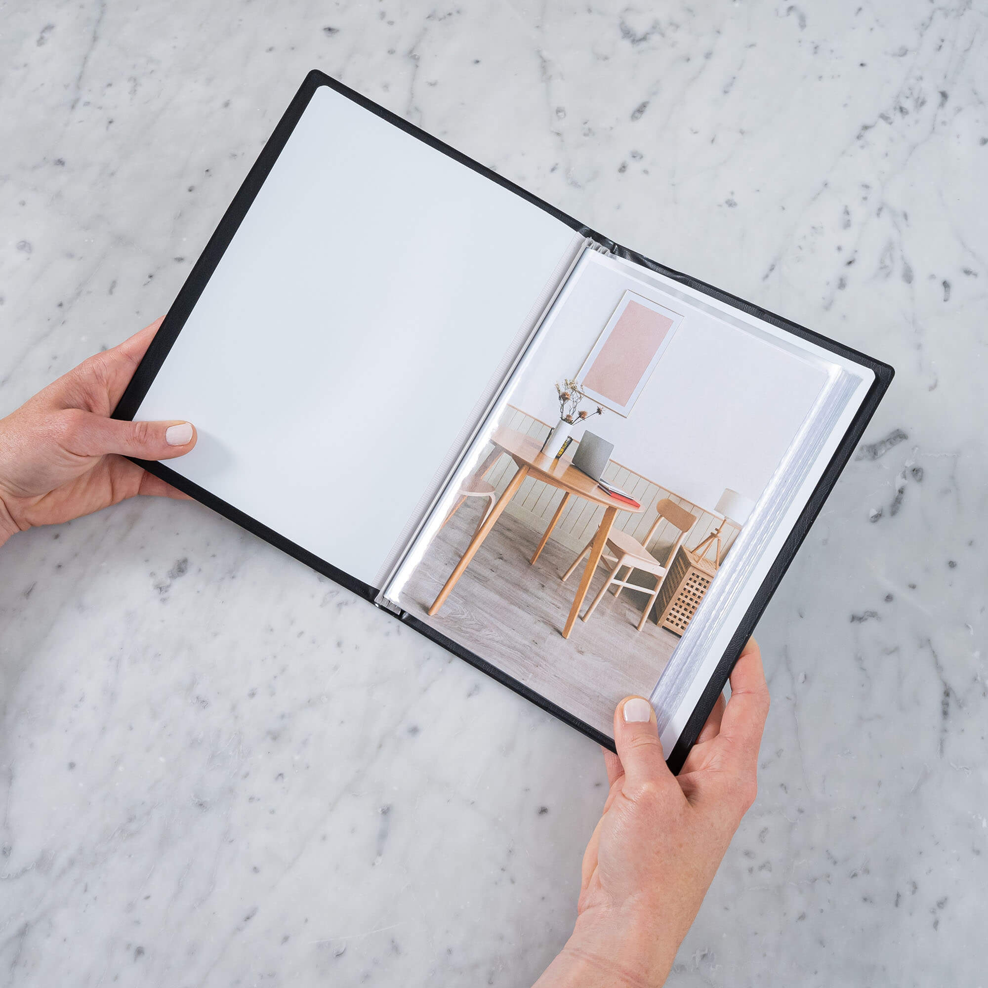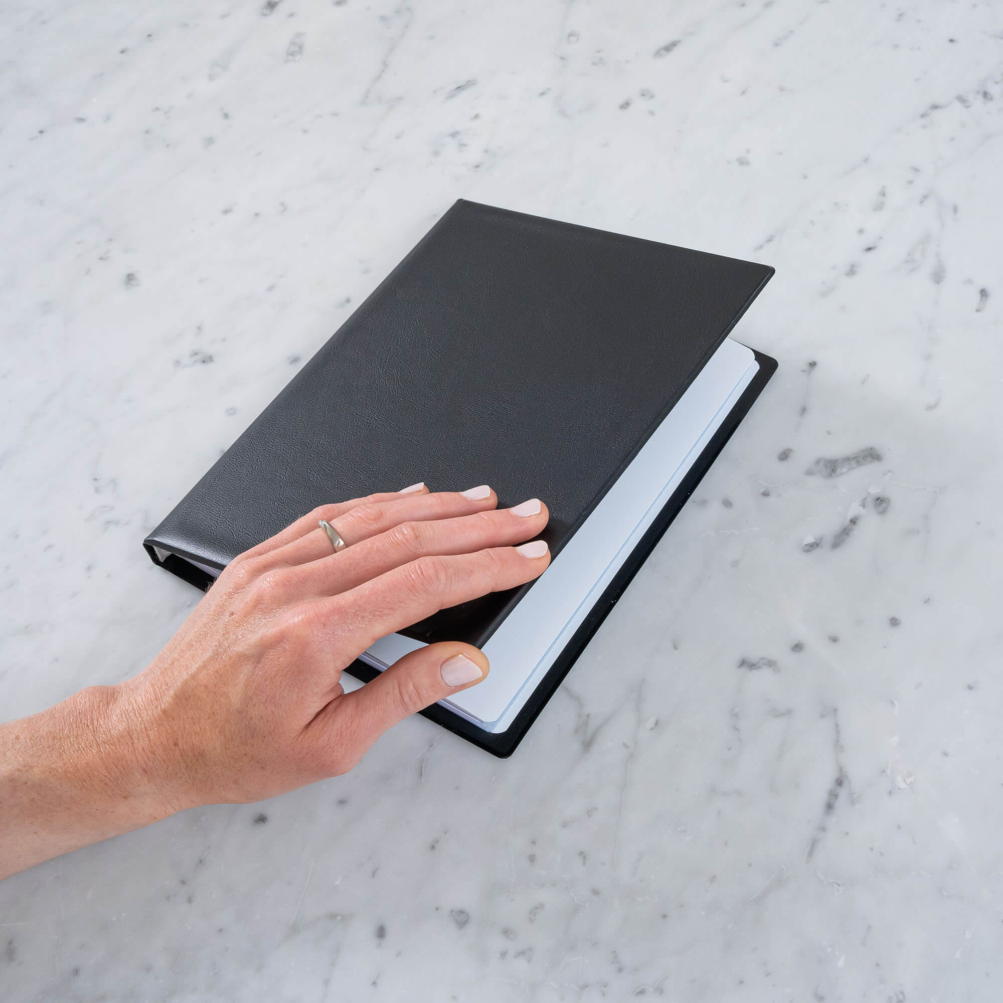 Rillstab display book A5 original made of grained plastic material. Inside, is the Rillstab mechanism, with 30 internal pockets = 60 x A5 size made from acid-free polypropylene. The internal pockets are made of polypropylene material, glass clear, non-reflecting, thickness 50 mu. On the right inside vertical insert on full height. Colour black. Space and weight-saving compared to other presentation maps and ring binders. Turn over the pages like a book.